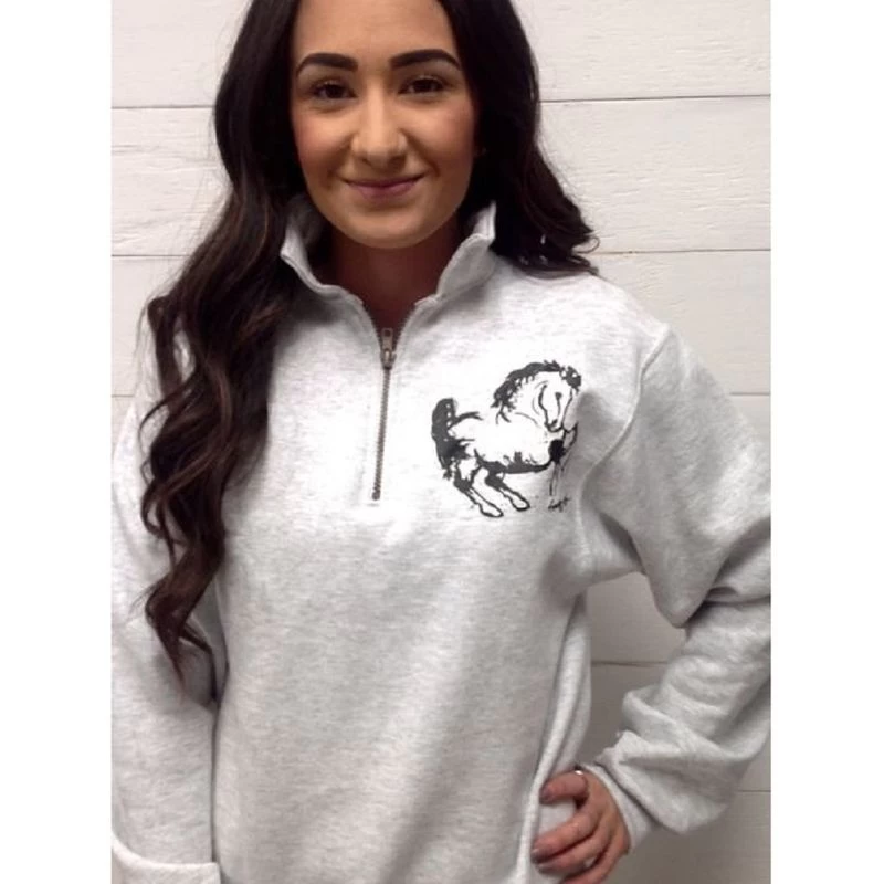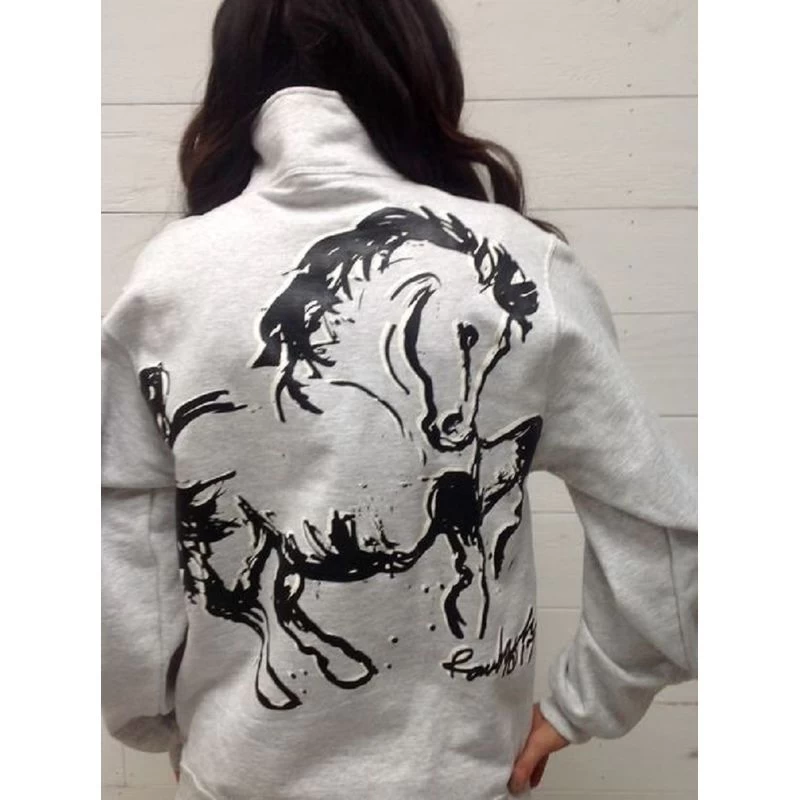 Animals to Wear clothing is unique because it features original artwork by Rebecca Raubacher, hand silk screened onto high-quality apparel. Boss” is a drawing of a horse in the pasture that has to boss every other horse around. He stomps and makes all kinds of commotion if anyone in the herd breaks the accepted routine and doesn’t hesitate to chase whoever catches his eye. Of course, he is always first coming in for meals.