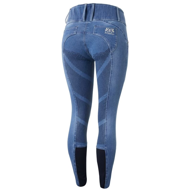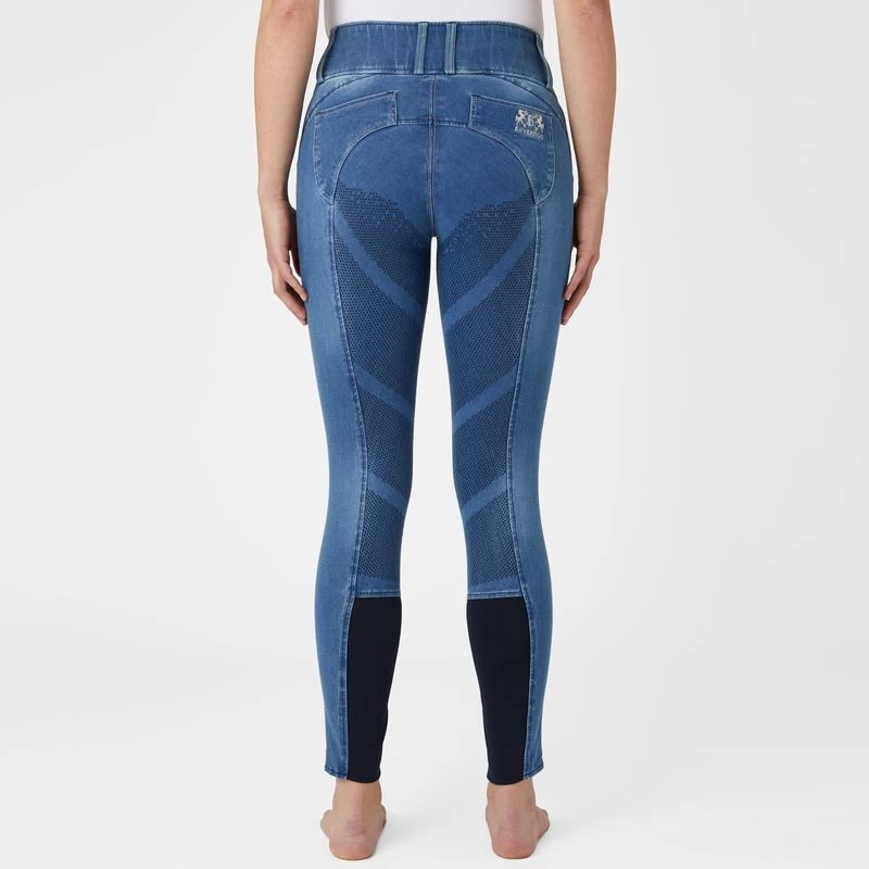 The B Vertigo Dianne breeches are made from soft, water and dirt repellent denim material. The high waist keeps them in place, and the silicone full seat keeps you in the saddle. Belt loops, 3 button closure and contrasting seams around pockets and belt loops add to the typical jeans look. Breathable fabric keeps you cool while riding or in the stables. Subtle B Vertigo embroidery adds a chic detail.