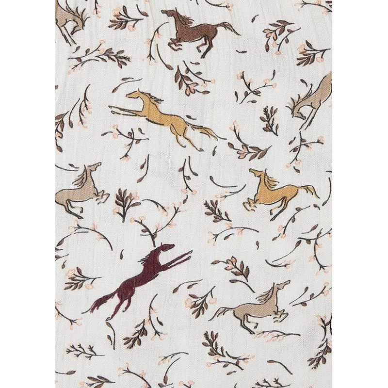 Muted earth tones make it simple to style with leggings, pants, or shorts, and playful horse prints gallop toward any adventure. A turn-down collar, rolled cuff sleeves, and back yoke shirring make this breathable top an indispensable summer staple.