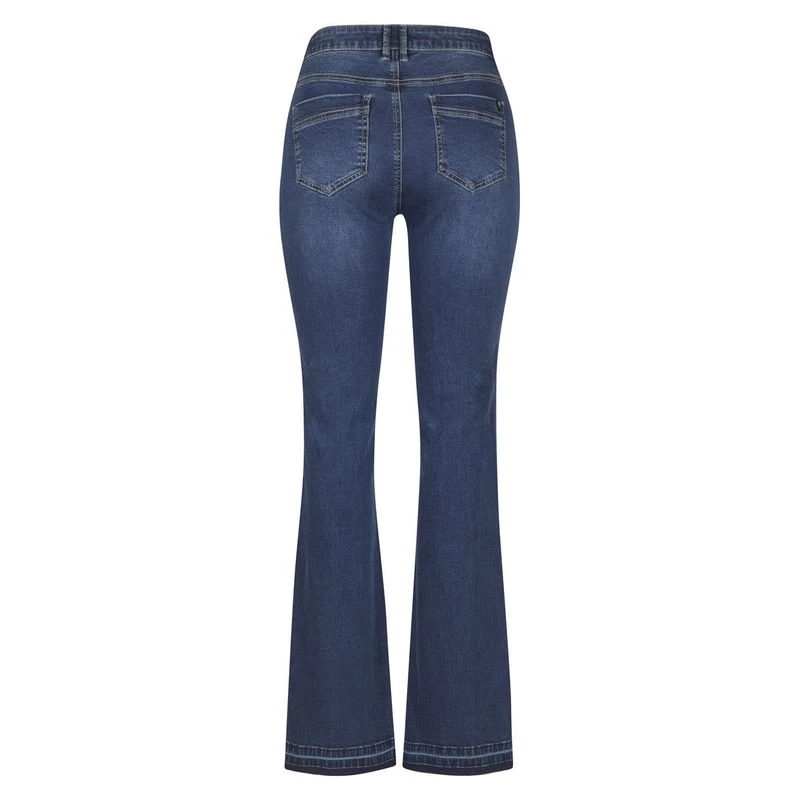 - Bootcut silhouette visually slims the hips and lengthens legs