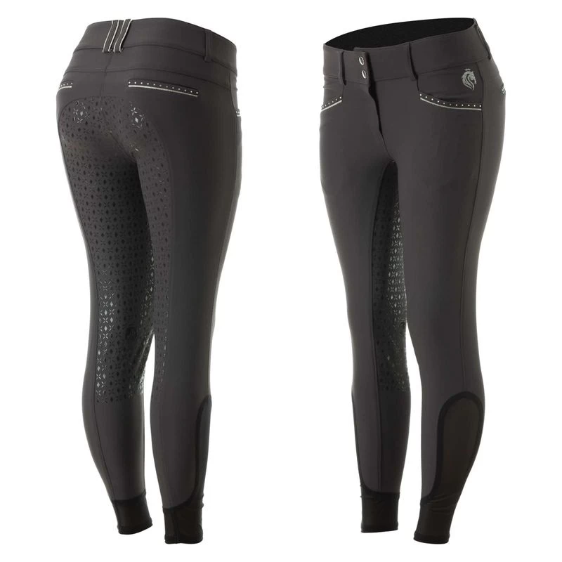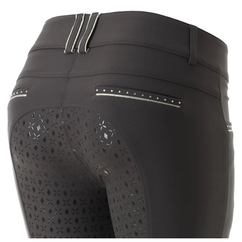 The Equinavia Victoria Womens Silicone Full Seat Breeches are made of high quality technical fabric that is breathable, moisture-wicking, and quick-drying. Spandex provides stretch for maximum freedom and support while keeping its shape. Silicone grip offers ultimate security in the saddle, while mesh at the lower legs keeps you cool and streamlined underneath the boots. Finished with a silver lurex logo on the left pocket as well as silver piping and crystals on the front pocket and the back fake pocket will make you stand out in the ring.