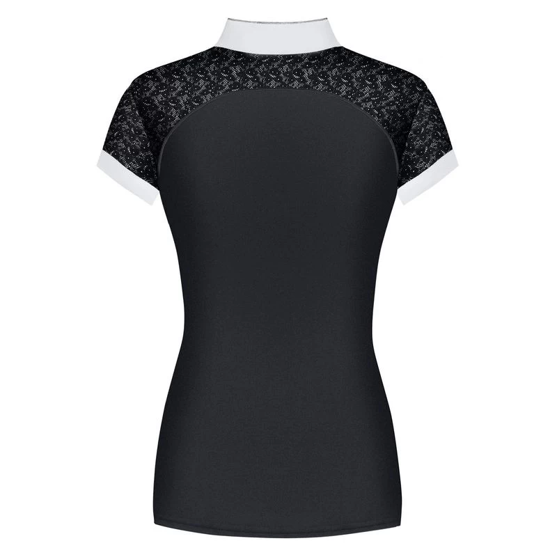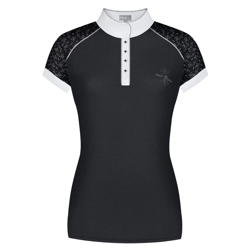This feminine, sporty show shirt is made of a stretchy recycled technical fabric that is breathable and moisture wicking. It has stretch lace inserts on the shoulders that add both comfort and style to the shirt. The tab collar is fastened with decorative buttons on a front placket, and is decorated with shimmering piping. There is a Fair Play logo with crystals.