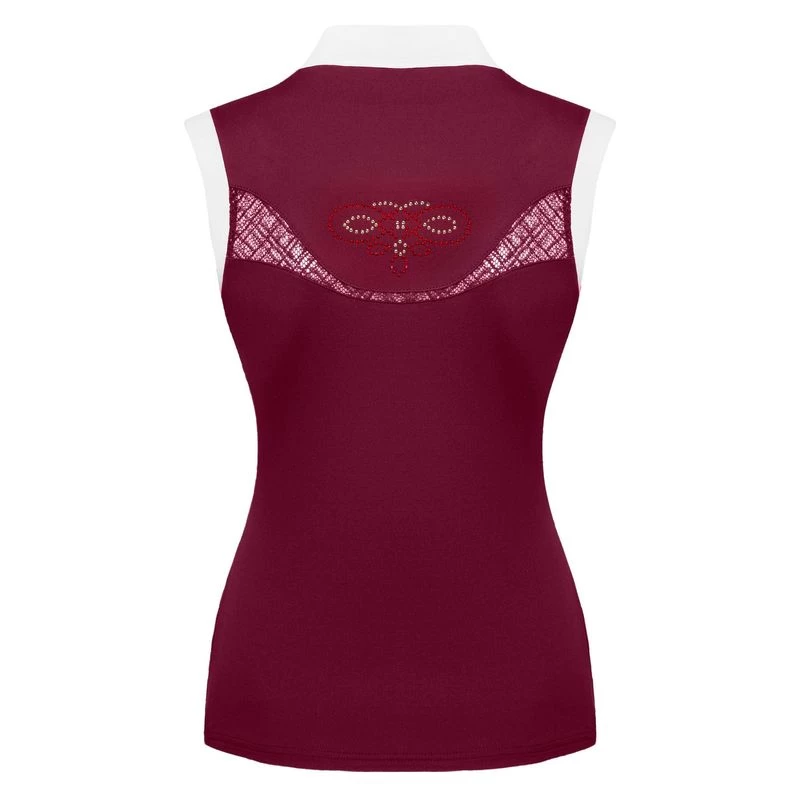 This show shirt is made of stretchy, breathable and moisture wicking fabric with UV protection and mesh inserts. It is sleeveless for the most airflow. The tab collar/placket is secured with decorative buttons. The Rose Gold jet decoration add a touch of feminine glitz.