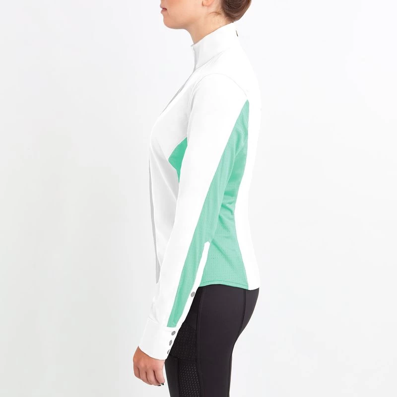 Constructed in lightweight 4-way stretch-woven CoolStretch fabric paired with high stretch IceMesh. Features include a button front, button cuffs, and shoulder darts that provide a beautiful fit and allows for optimum mobility.