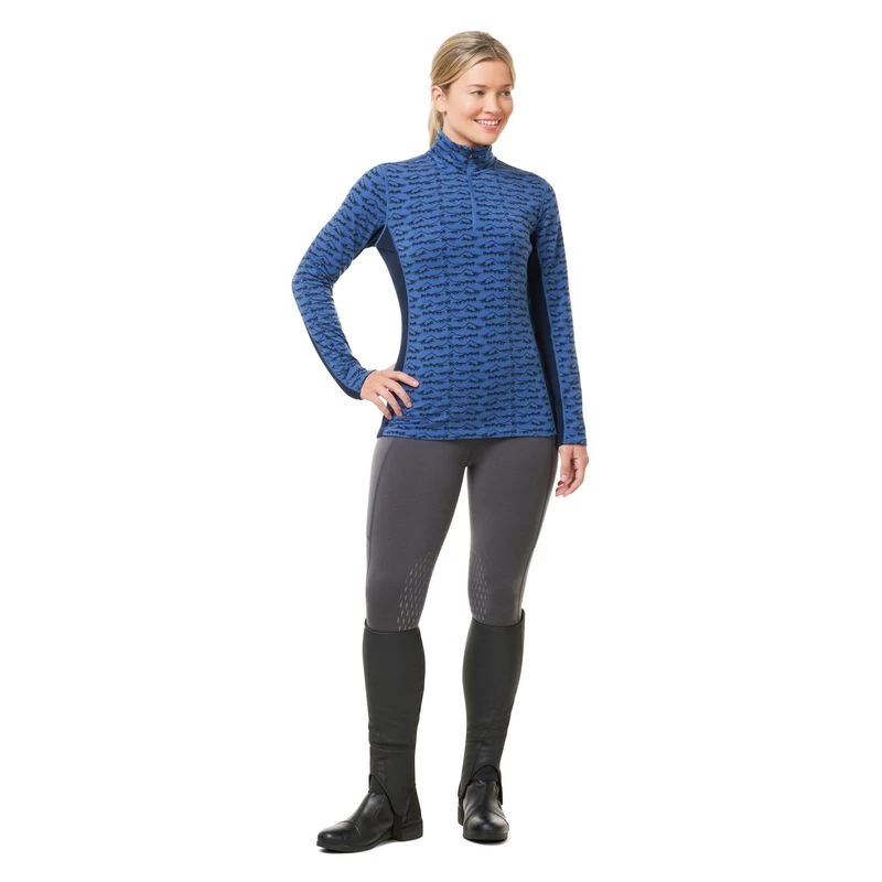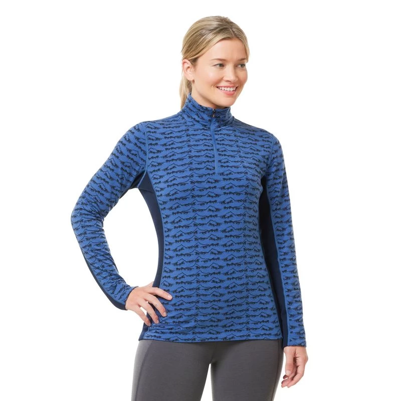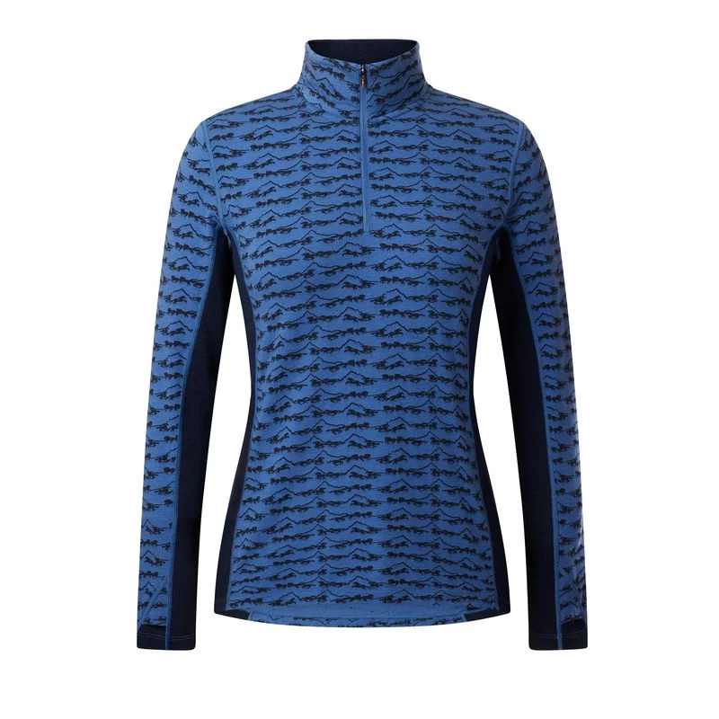 Happy horses frolic amid mountains framed by slimming contrast panels for a super-soft washable Merino layer that keeps you comfy through an active day.