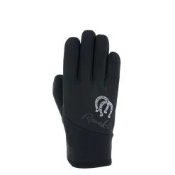 A soft brushed elastic poly material on the backhand ensures a both comfortable and snug wear. The discreet Velcro fastener below the palm is unobtrusive and gives a great fit. The backhand features sparkling silver horseshoes as well as an elaborately printed, glittery Roeckl logo.