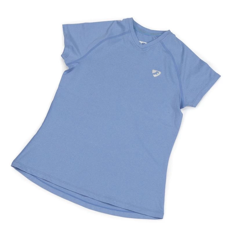 This tee shirt features technical fabric with comfortable non-scratch flatlock seams. The vee neck is child appropriate – not overly deep. The raglan seaming on the short sleeves allow for a full range of movement.